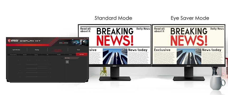 Software Display Kit eksklusif dari MSI adalah teman terbaik Anda di tempat kerja atau saat bermain. Ini membuat pekerjaan Anda lebih mudah dengan memberi Anda fungsi-fungsi yang nyaman seperti split-window, pengaturan warna, dan eye saver mode. Dukung diri Anda hingga akhir permainan dengan anti-glare display. Eye saver mode yang dapat diaktifkan oleh MSI Display Kit bersama dengan anti-glare display membuat mata Anda lebih sedikit stres dan memungkinkan Anda untuk bekerja lebih banyak namun tetap nyaman. Desain penyangga PRO MP241 yang dapat disesuaikan juga memungkinkan Anda menemukan tempat yang nyaman di tempat kerja Anda. Duduk dengan nyaman dan menikmati pemandangan terbaik sehingga Anda dapat bekerja semaksimal mungkin.